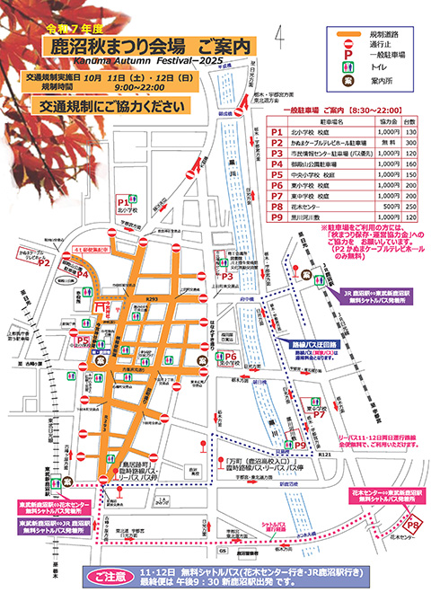 ※鹿沼市花木センターは1台500円/日、かぬまケーブルテレビホールは無料です。 - 会場付近の駐車場は大変込み合いますので、シャトルバス(無料)やリーバス(鹿沼市のコミュニティバス・当日全線無料)もぜひご利用ください!