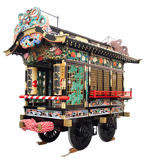 文政11年(1828)製作の屋台で、「石塚知興(初代直吉)」の刻名と、天保12年(1841)の屋台箱墨書銘が見られる黒漆塗彩色彫刻屋台である。